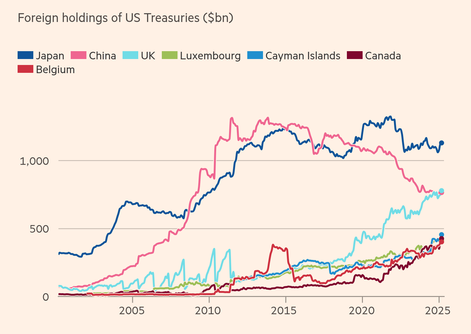 China fell from the second-largest foreign holder of US Treasuries to the third-largest, after Japanese and UK investors, as the country continues to de-risk from US assets.