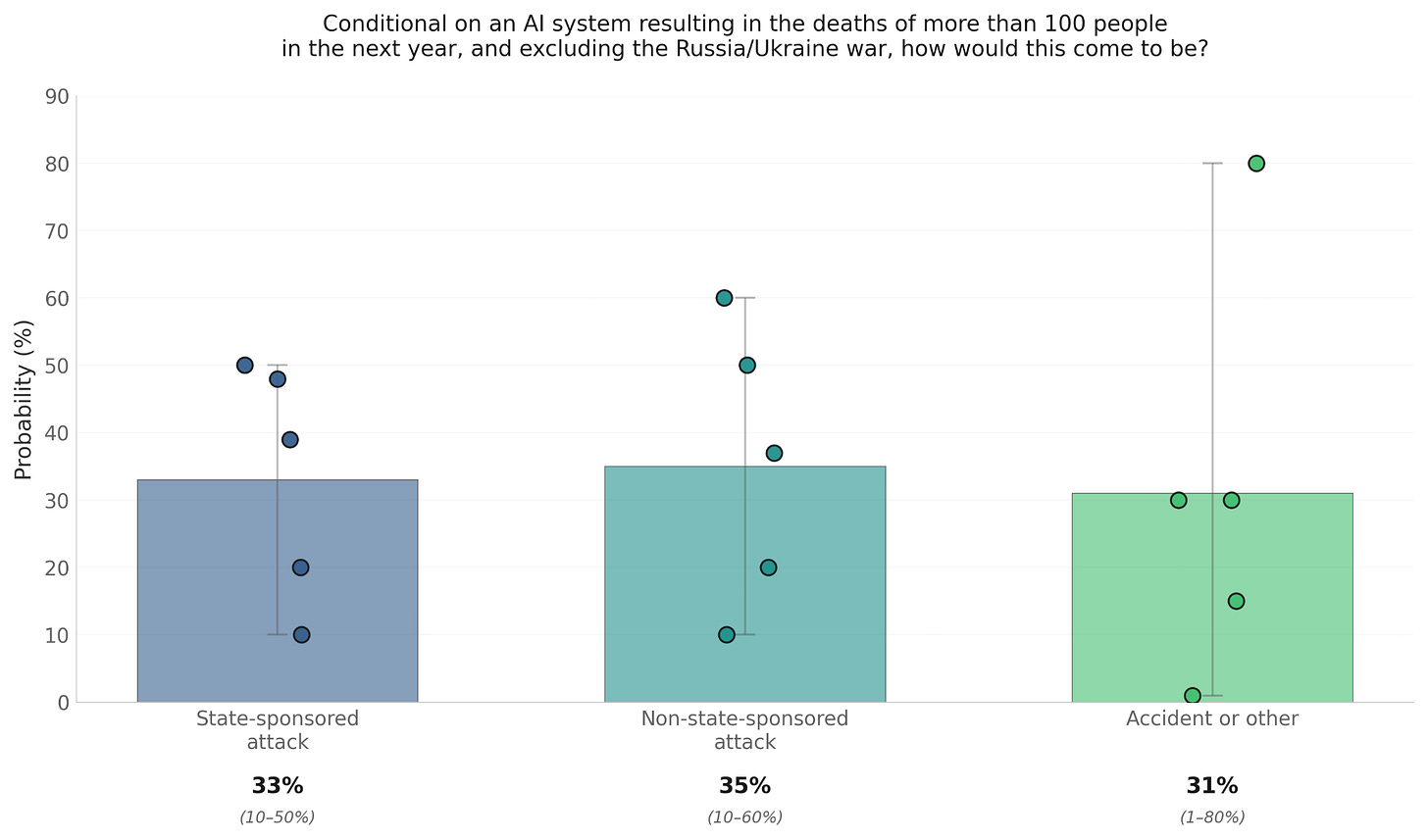 Conditional on at least one AI system causing more than 100 deaths in the next 12 months, and excluding any such use in the Russia/Ukraine war, forecasters think there’s a 33% chance that the first such incident would be because of a state-sponsored attack, a 35% chance that it would be caused by a non-state-sponsored attack, and a 31% chance that it would be the result of an accident/other.