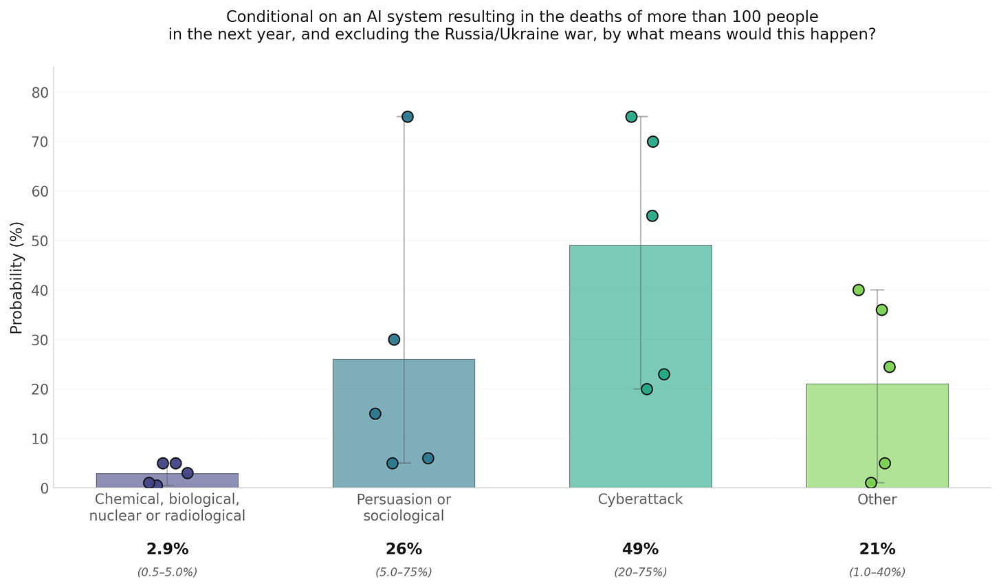They also think there’s a 49% chance that it would be the result of a cyberattack, a 2.9% chance that it would be caused by a CBNR attack, a 26% chance it would be caused by persuasion or sociological means, and a 21% chance that there would be some other cause/mechanism. Forecasters’ estimates are fairly spread out, but they agree that most of the risk given this relatively low threshold does not come from CBNR attacks.